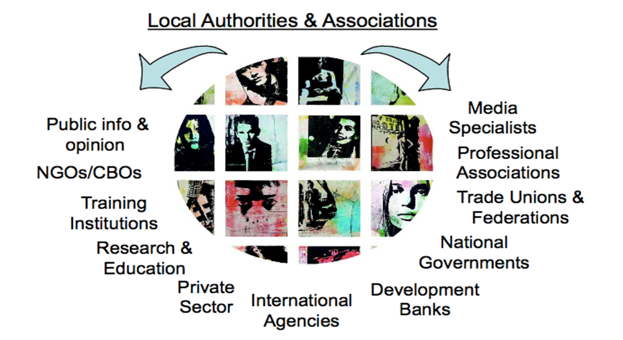 local and central government departments, political representatives, organisations responsible for infrastructure, CBOs, NGOs, residents’ organizations and chamber of commerce