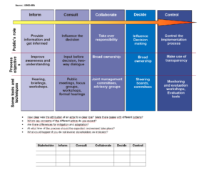 What stakeholder needs to be involved for each concrete action, ways to involve them; (from being in charge of steering to implementing, to only being informed/providing information),